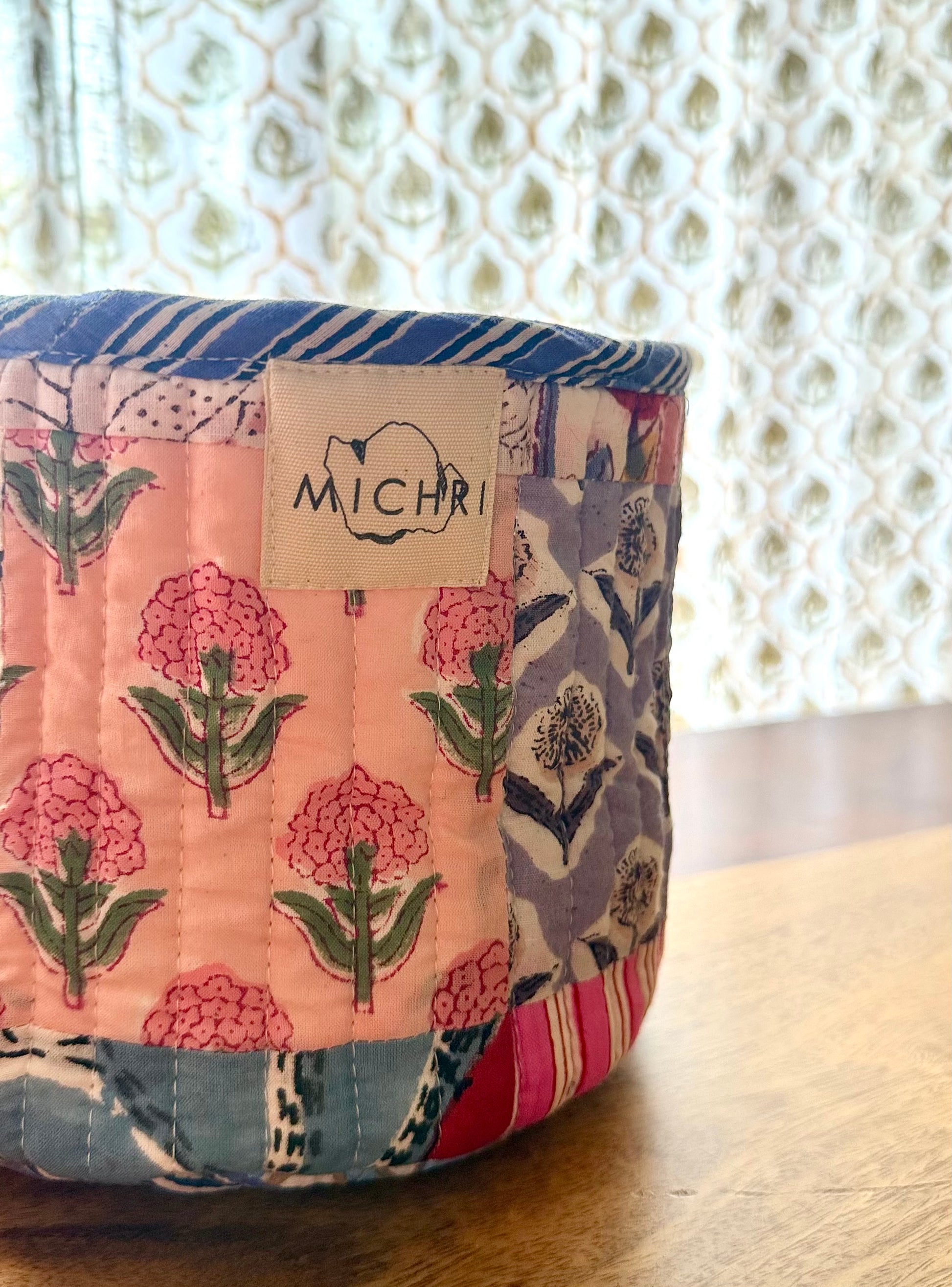 This is more than just storage—it's a sustainable beauty. Each quilted basket features meticulously cut and patch-worked fabrics embodying our effort to reduce textile waste.